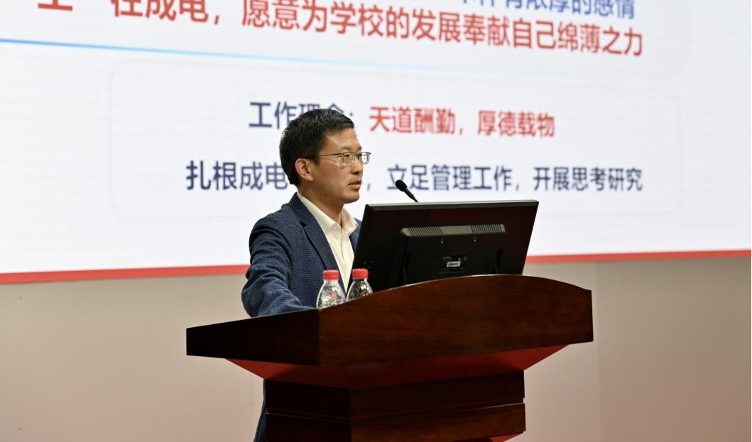 赵强结合自己服务学生、老师的点滴故事,分享了对“立足本职 服务师生”的理解。他表示,自己在辅导员岗位工作多年,深切感到服务学生就是要给学生创造合适的平台和空间,让他们充分发挥自身的潜能;后来,自己到学院办公室工作,服务的对象变成了老师,因此,自己及时转换工作思维,深入了解每一位老师的情况和需求,从而为老师们提供更加精准的服务和支持。他表示,在和师生密切交往的过程中,学院师生、校友身上展现的进取精神、家国情怀,也在不断地激励自己更加热爱工作,踔厉奋发、勇往直前。